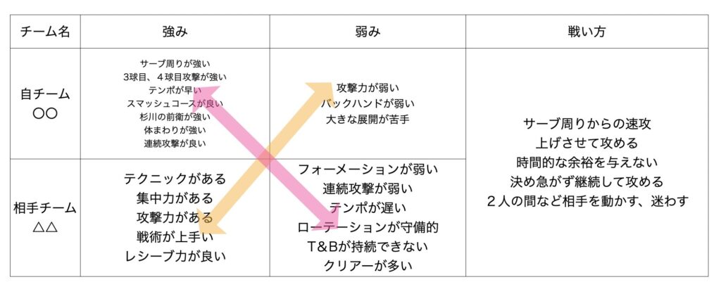 自チームの強みと相手チームの弱み、自チームの弱みと相手チームの強みをクロス分析して戦い方の作戦を立てる。基本的には、自分の強みで相手の弱みを攻めて、相手の強みを封じて、自分の弱みを攻められないようにする。